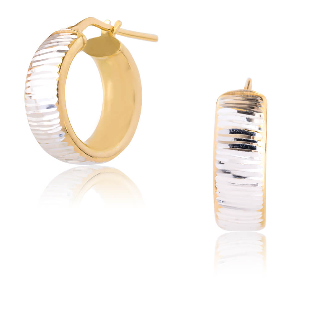 Ασημένια κρικάκια φαρδιά, σε δίχρωμο σχέδιο με επιχρύσωμα και επιπλατίνωμα. Έχουν μοντέρνο σχέδιο με ανάγλυφες ραβδώσεις. Η διάμετρός τους είναι 1.7 cm και το πλάτος τους 0.6 cm.