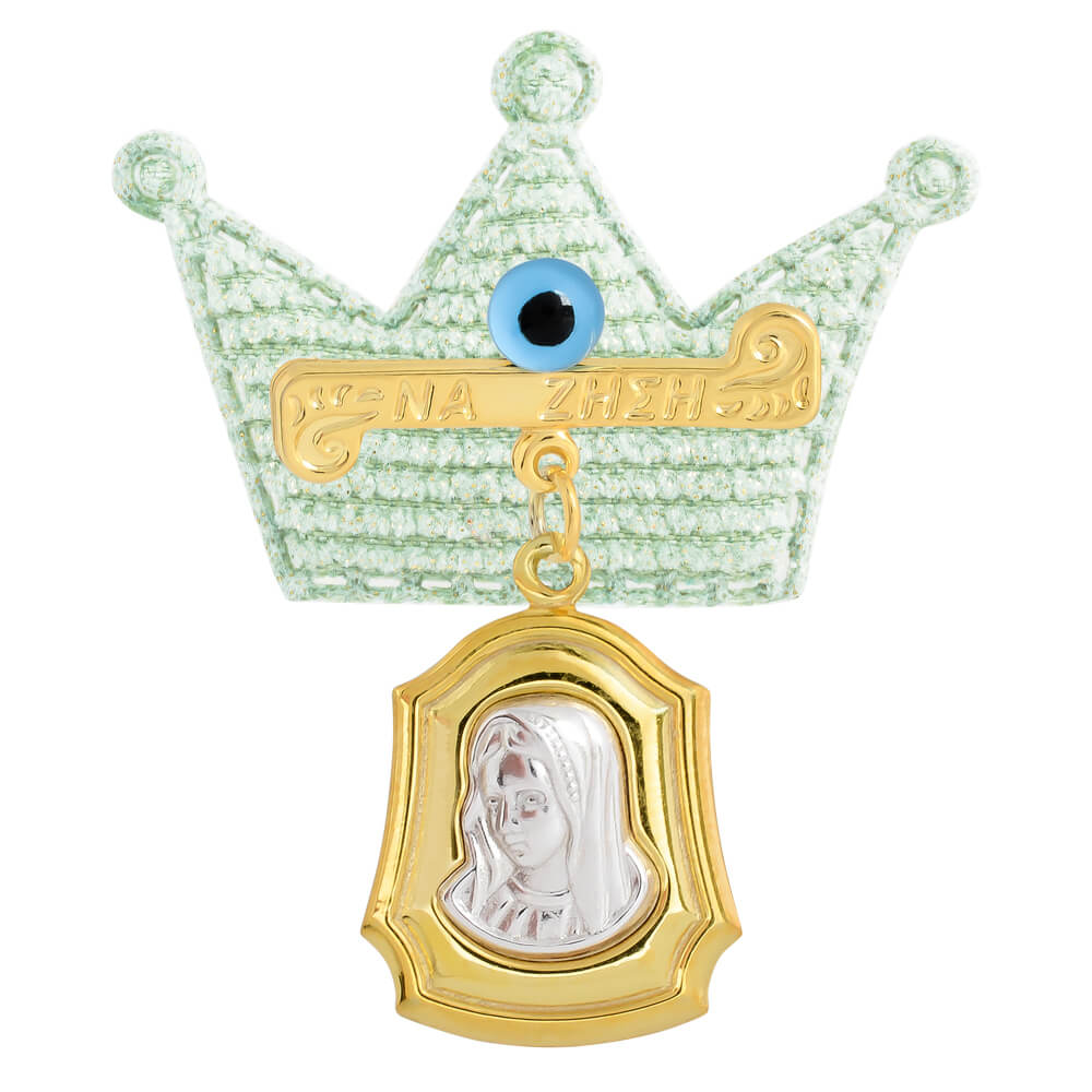 Ασημένιο φυλαχτό για αγοράκι 925 με δίχρωμο επιχρύσωμα, σε βεραμάν βελούδινο μαξιλαράκι. Η παραμάνα είναι διακοσμημένη με ματάκι γαλάζιο και αναγράφει την ευχή “ΝΑ ΖΗΣΗ”. Το κρεμαστό φυλαχτό έχει την Παναγία σε ανάγλυφο σχέδιο. Όλα τα στοιχεία είναι επιχρυσωμένα – επιπλατινωμένα, ώστε το ασημένιο κόσμημα να μη μαυρίσει και να έχει λαμπερό χρώμα. Η παραμάνα περιλαμβάνει και το βεραμάν βελούδινο μαξιλαράκι σε σχέδιο στέμμα πρίγκιπα. Αποτελεί εξαιρετική επιλογή δώρου για ένα νεογέννητο αγοράκι ή για δώρο βάπτισης. Συνήθως, οι γονείς το καρφιτσώνουν στην κούνια ή στο καρότσι του μωρού για γούρι και προστασία. Ωστόσο, δεν συνιστούμε να καρφιτσώνετε πάνω στα ρούχα του μωρού για λόγους ασφαλείας! Το φυλαχτό μενταγιόν μπορείτε να το φερέσετε στο παιδί και ως κρεμαστό για τον λαιμό με μια αλυσίδα ή κορδονάκι. Το ασημένιο φυλαχτό για αγοράκι συνοδεύει υπέροχη συσκευασία δώρου και έντυπο εγγύησης προδιαγραφών προϊόντος από την Κοσμηματοθήκη.