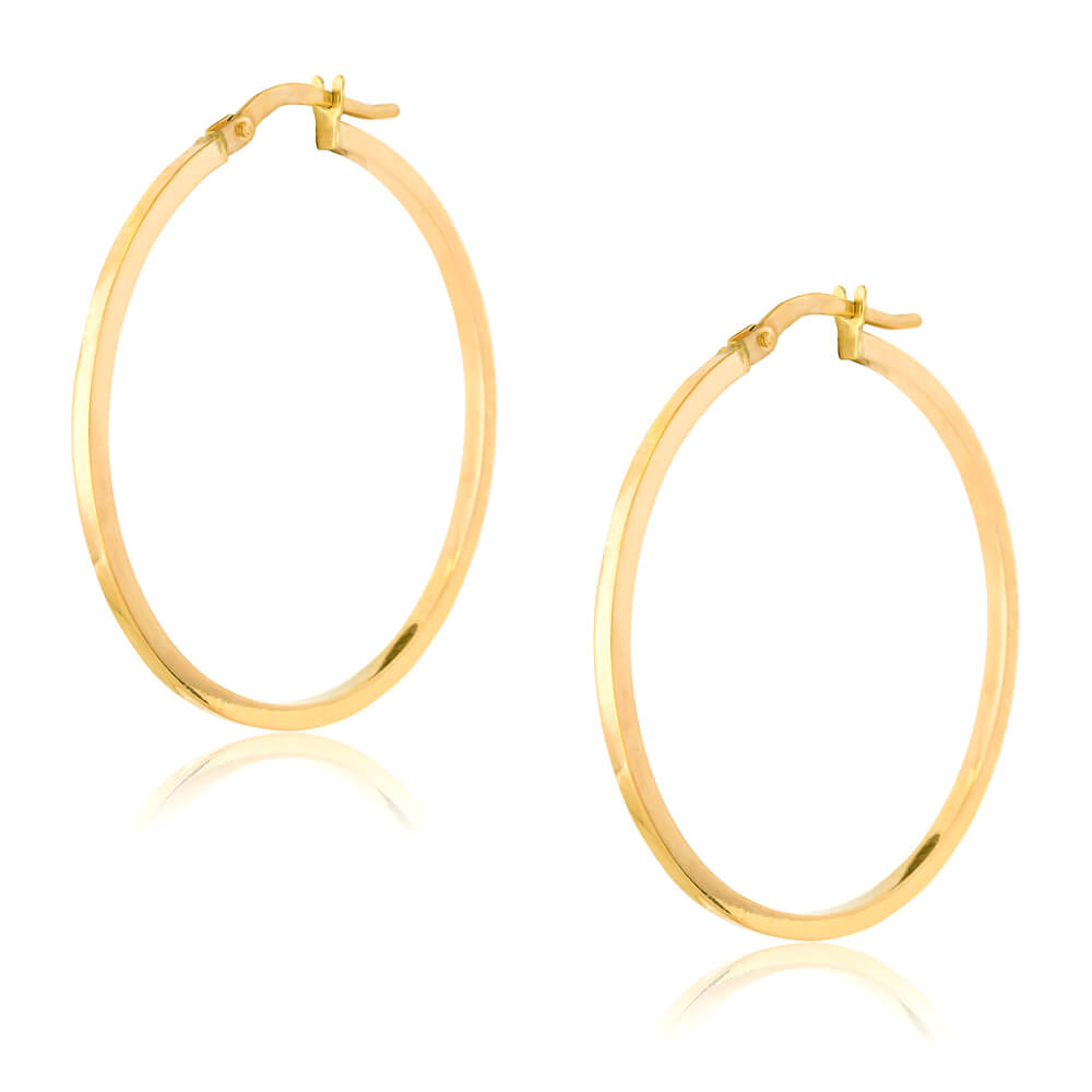 Κρίκοι λεπτοί από χρυσό 9 καρατίων, σε στρογγυλό σχήμα με πλακέ επιφάνεια. Έχουν διάμετρο 3.4 cm και πλάτος 2 mm. Ιδανικοί για να τους συνδυάσετε με κάθε στιλ!