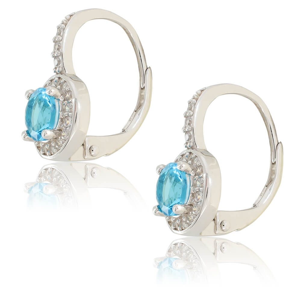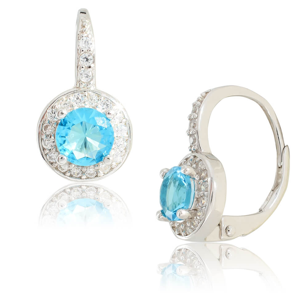 Κρεμαστά σκουλαρίκια με γαλάζια πέτρα από ασήμι 925 επιπλατινωμένο, σε σχέδιο ροζέτα, με στρογγυλή γαλάζια πέτρα και λευκά ζιργκόν.