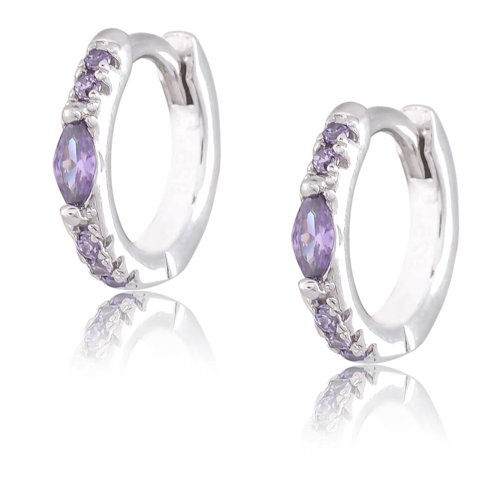 Κρικάκι με πέτρες ασήμι 925 επιπλατινωμένο, σε διακριτικό σχέδιο. Τα στρογγυλά κρικάκια έχουν διάμετρο 1.3 cm και τα κσομούν πέτρες ζιρκόν σε μοβ λιλά χρώμα. Ιδανικά και για παιδικά.
