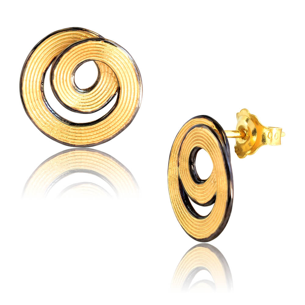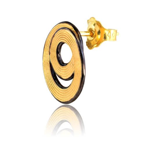 Μοντέρνα χρυσά σκουλαρίκια 14Κ, σε ιδιαίτερο σχεδιασμό με ανάγλυφες ρίγες και λεπτομέρεια από μαύρο επιχρύσωμα. Ιδανικά για ξεχωριστές εμφανίσεις!