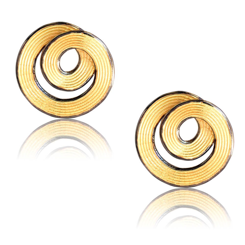 Μοντέρνα χρυσά σκουλαρίκια 14 καρατίων, σε πρωτότυπο σχέδιο. Έχουν καρφωτό κούμπωμα και επιφάνεια με διάμετρο 1,4 cm και ιδιαίτερο πλέξιμο με ανάγλυφες ρίγες. Το φινίρισμά τους είναι ματ και διαθέτουν περιμετρικά λεπτομέρεια από μαύρο επιχύσωμα. Ένα ξεχωριστό κόσμημα που θα φοράτε οποιαδήποτε ώρα της ημέρας και θα συνδυάσετε εύκολα με τα υπόλοιπα κοσμήματά σας! Αποτελεί ιδανική επιλογή και για ιδιαίτερες βραδινές εμφανίσεις. Τα μοντέρνα χρυσά σκουλαρίκια συνοδεύει πολυτελής συσκευασία δώρου και έντυπο εγγύησης προδιαγραφών από την Κοσμηματοθήκη.