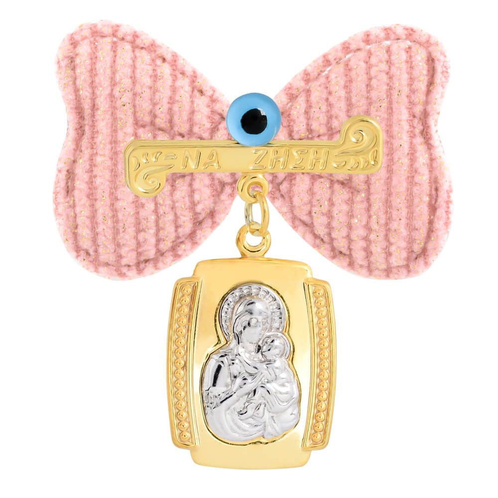 Παναγία για μωρό ασημένια 925, με δίχρωμο επιχρύσωμα. Έχει ορθογώνιο ανάγλυφο κρεμαστό με την Παναγία Βρεφοκρατούσα. Στην παραμάνα με ματάκι αναγράφεται “ΝΑ ΖΗΣΗ”. Περιλαμβάνεται το ροζ βελούδινο μαξιλαράκι φιόγγος.