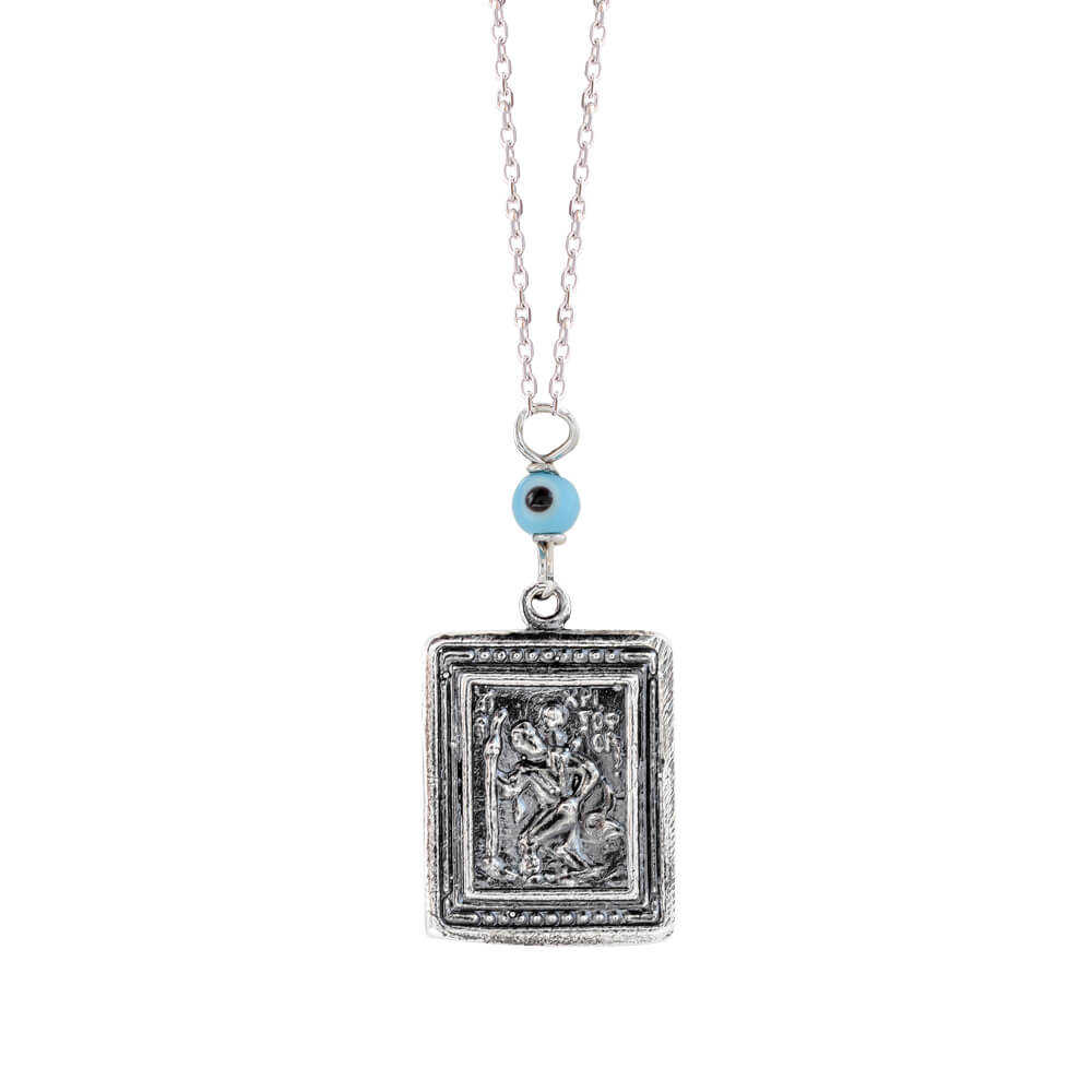 Φυλαχτό αυτοκινήτου από ασήμι 925 , διπλής όψης, με την Παναγία και τον Άγιο Χριστόφορο. Διαθέτει αλυσίδα για να κρεμαστεί στο αυτοκίνητο και μικρό ματάκι.