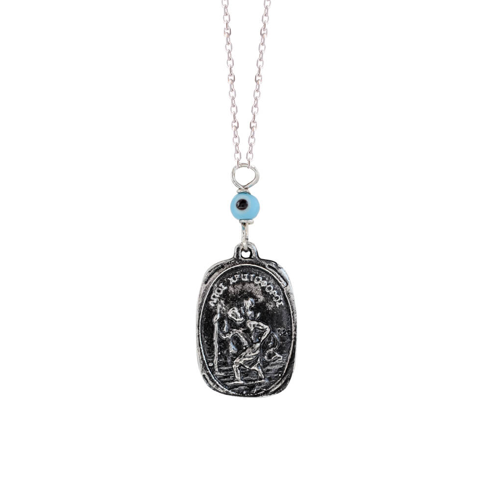 Φυλαχτό αυτοκινήτου ασήμι 925 , διπλής όψης, με την Παναγία και τον Άγιο Χριστόφορο. Διαθέτει αλυσίδα για να κρεμαστεί στο αυτοκίνητο και μικρό ματάκι.