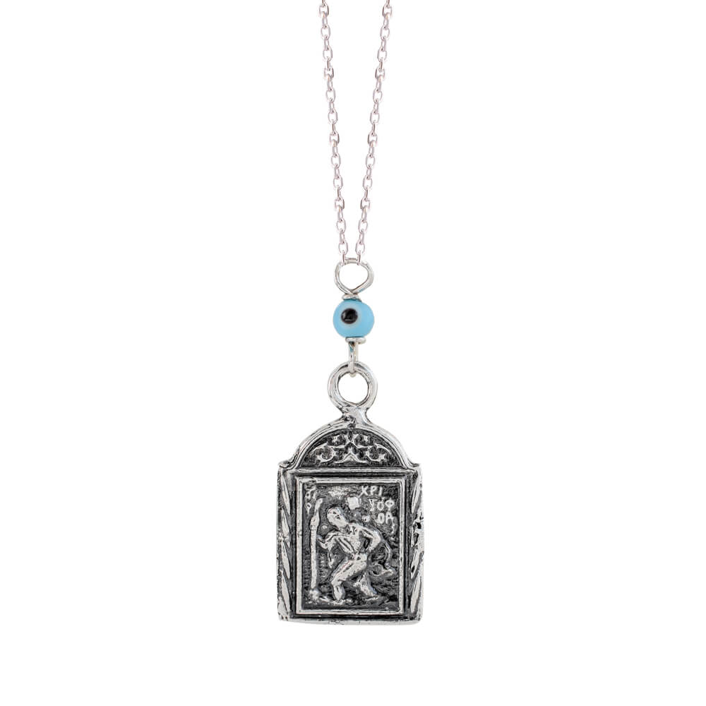Φυλαχτό αυτοκινήτου ασημένιο 925 , διπλής όψης, με την Παναγία και τον Άγιο Χριστόφορο. Διαθέτει αλυσίδα για να κρεμαστεί στο αυτοκίνητο και μικρό ματάκι.