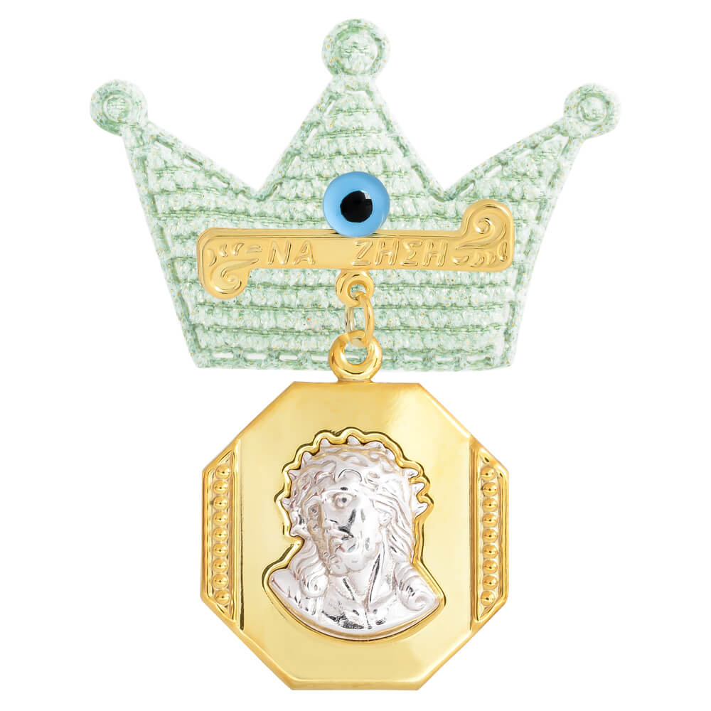 Φυλαχτό Χριστός από ασήμι 925 με δίχρωμο επιχρύσωμα, σε βεραμάν βελούδινο μαξιλαράκι. Η παραμάνα είναι διακοσμημένη με ματάκι γαλάζιο και αναγράφει την ευχή “ΝΑ ΖΗΣΗ”. Το πολύγωνο κρεμαστό φυλαχτό έχει την κεφαλή του Ιησού Χριστού σε ανάγλυφο σχέδιο. Όλα τα στοιχεία είναι επιχρυσωμένα – επιπλατινωμένα, ώστε το ασημένιο κόσμημα να μη μαυρίσει και να έχει λαμπερό χρώμα. Η παραμάνα περιλαμβάνει και το βεραμάν βελούδινο μαξιλαράκι σε σχέδιο στέμμα πρίγκιπα. Αποτελεί εξαιρετική επιλογή δώρου για ένα νεογέννητο αγοράκι ή για δώρο βάπτισης. Συνήθως, οι γονείς το καρφιτσώνουν στην κούνια ή στο καρότσι του μωρού για γούρι και προστασία. Ωστόσο, δεν συνιστούμε να καρφιτσώνετε πάνω στα ρούχα του μωρού για λόγους ασφαλείας! Το φυλαχτό μενταγιόν μπορείτε να το φερέσετε στο παιδί και ως κρεμαστό για τον λαιμό με μια αλυσίδα ή κορδονάκι. Το φυλαχτό Χριστός από ασήμι συνοδεύει υπέροχη συσκευασία δώρου και έντυπο εγγύησης προδιαγραφών προϊόντος από την Κοσμηματοθήκη.